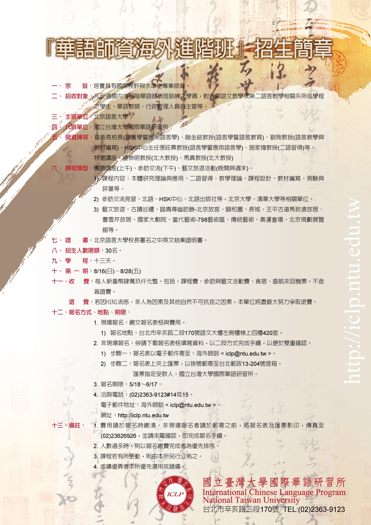 海外師訓班開放報名: 【華語師資海外進階班2009期】即日起正式對外開放報名,本班的宗旨是培養具有國際視野的專業者。名額有限,額滿為止,敬請儘速行動。(詳情請見海報或2009華語師資海外進階班) |