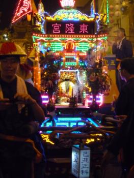 In one of the most exciting ceremonies I saw, troupes of male participants brought effigies of their temples’ respective deities to visit the Wang Ye and other lesser deities enshrined at Donglong. During the ceremony, deities control their troupes, sending them into a trance state. One can tell when someone is in a trance (some might call this possession) because the small palanquins which contain the deities begin bouncing up and down erratically. Sometimes this can be quite a scene as many of the palanquins are “blinged out” with neon lights, and thus a generator must follow the troupe (also carried by minor troupe members). Daoist priests converged at one point to perform their own ceremonies, gowns glistening in the lights of the surroundings.