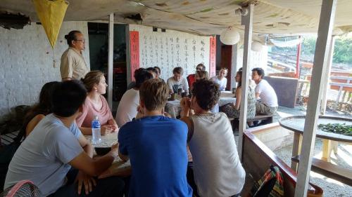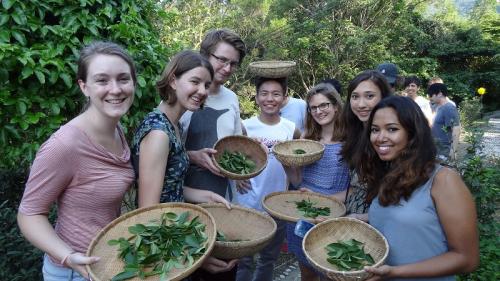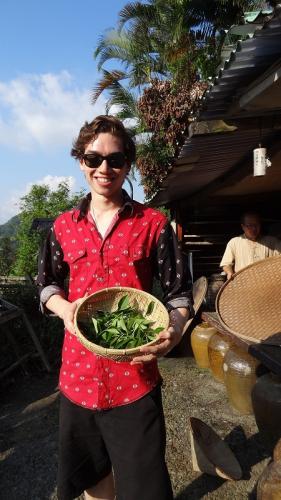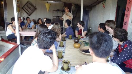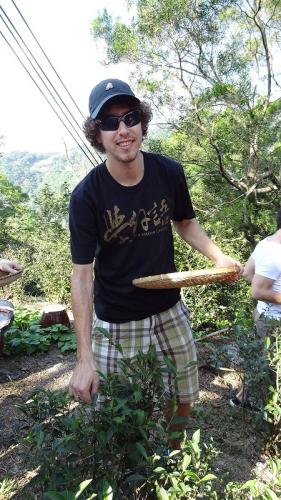 我們一到茶園就認識了一位茶藝講師,叫周仁智。周仁智也是茶館的老闆,而且他那天是大家的主人。主人歡迎大家以後,他帶我們到茶園去。因為時間的關係,學生們都需要很快地學怎麼識茶、備茶、賞茶什麼的。 當然茶藝不是三個鐘頭以內能學好的,但大家都對茶藝很感興趣,所以學跟茶藝有關的知識越豐富越好。我們先採青,再把茶葉拿回茶館。根據主人說的,茶葉越軟越新鮮,而且如果茶葉很新鮮,茶也會更好喝。賞茶以後大多數的學生在原則上同意這個觀點。