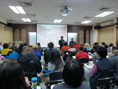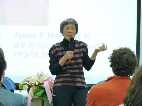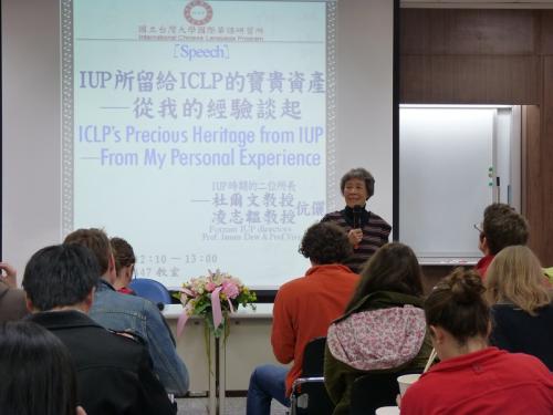 ICLP邀請IUP前所長杜爾文教授及淩志韞教授三月七日來給全所師生演講。雖然杜教授因感冒而無法出席,大家沒有機會見到杜教授本人,但淩教授的演講精彩生動,聽眾都滿載而歸。淩教授演講的題目是『IUP所留給ICLP的寶貴資產--從我的經驗談起』。淩教授在447教室的前面演講時,她背後的PPT播的是IUP時代,包括學生和老師們一起去校外教學的一些舊照片,在這些照片裏頭,每位聽眾不但能看到前所長杜爾文教授、淩志韞教授,他們也能找到又漂亮又年輕的老師們,像陳立元,周長楨,和范美媛等。從這個照片可以看出來IUP在臺大變成ICLP以後,基本上沒有什麼大的改變,連學生休息室的一些家具都沒有換新的。這個現象足以反應出從IUP ICLP得到了很寶貴的資產。這個IUP傳給ICLP的資產到底是什麼呢?為了了解淩志韞教授演講的精華,我想理解淩志韞教授認為對外漢語的目的是什麼是很重要的。她舉個比喻來說明,在Seaworld的一些教練經常跟海豚和鯨魚游泳,雖然他們本身不是這類的動物,可是他們已經被這些動物接受了,而且海豚和鯨魚願意跟他們游泳和互動。對外漢語教育本身不是為了讓外國學生變成中國人,而在於讓學生理解中國和給學生跟中國人溝通的門徑。在她的職業中,淩志韞教授在Oberlin大學教了很多年,而且從1994-1997是IUP的所長,她也修改或編了一些我們現在還用的課本,比如:《新選廣播劇》、《廣播劇選集》、《台灣社會短文集》、《從精讀到泛讀》等。