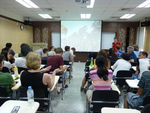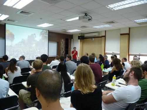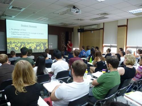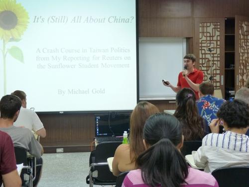 7月25日ICLP校友和路透社記者金邁克(Mr. Michael Gold)來講有關他在台灣的報導經驗,尤其是兩三個月以前的太陽花學動。這裡太陽花學運是指今年三月數百名學生、平民至少占領立法院三個星期,以反對《海峽兩岸服務貿易協議》批准的運動。在他的報告中,金邁克闡述太陽花學動政治上的背景,並展示好幾張他所拍攝的照片。