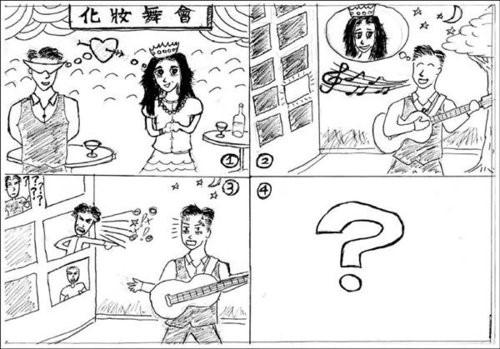 在化裝舞會上,我穿著?西裝,戴著面罩,站在房間的一角。我一定看起來很奇怪, 可是因為其他人都跟我一樣看起來很奇怪,所以我就不那麼緊張了。我以為化裝舞會會很有意思,可是沒想到卻很無聊。我看著房間的樣子。在房間的正中,有人在一起跳舞,在一個角落有些女孩兒嘻嘻哈哈地聊天,在房間的對面有些人默默地坐著,我猜他們可能沒有自信請人一起跳舞。
