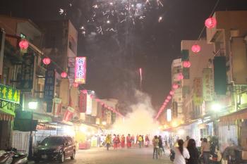 我跟著另外兩個同學碎步疾跑到充滿人山人海的朝天宮,我們發現媽祖已經出巡了,因此漫無目的地尋找其他出巡中的神明。當我們走在小巷中,我們突然發現所有的路人都急促地往馬路兩邊移動,圍觀著中間放長鞭炮的人。此時路旁的小吃攤也急忙收拾食物,立刻把桌、椅及客人拉開馬路。所有的人站在路旁,手指摀著耳朵,眼睛半開,期待鞭炮爆炸。鞭炮導火線點火的瞬間,數以百計的鞭炮好像都同時爆炸,只留下一縷青煙跟碎紙片。