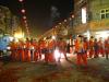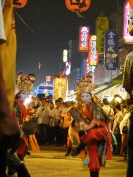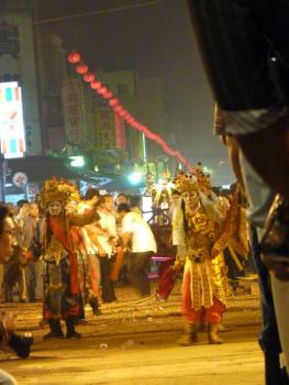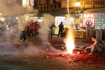 I scurried along, with two other classmates, to a crowded Chaotian temple only to discover that Mazu and her entourage were still out parading through the streets. Slightly dismayed we decided to wander the streets to see which deities were still out for a stroll. As we were waddling down one of the side streets, we noticed that the middle of the street suddenly became devoid of people as they made way for the people laying out long strands of firecrackers on the ground. The food vendors on both sides of the street covered all their food and pulled all their tables, chairs and customers back away from the street. All the bystanders just stood on the side of the street, fingers plugging ears, eyes partially open, waiting intently for the long chain of explosions. The fuse was lit, and in less than a fraction of a second hundreds of firecrackers seemed to pop simultaneously, leaving behind a huge plume of smoke and paper debris.
