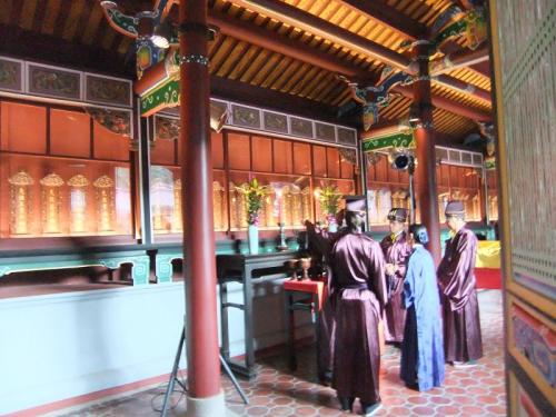 The adults dressed in blue and purple robes performed the prayers and sacrifices which were made in all the parts of the temple. Their moved gracefully and acted deliberately. Dozens of students dressed in yellow danced, and dozens of students dressed in red played music, in the style used in the rituals of Confucius's time. This is exactly the sort of experience the master would have wanted youth to have: he thought traditional music and dance elevated the spirit, and he once said that the Shao music affected him so much that after he heard it on one journey, he did not notice the taste of meat for three months because he was still marveling upon what he had heard (7:14). The fan dances were graceful, and the music was performed with traditional wind and percussion instruments. While the melody was only eight notes, each time it was repeated, its emotional effect seemed stronger.