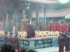 The service was immaculately performed, following a 38-point schedule and lasting exactly ninety minutes. About a hundred people, male and female, young and old, had roles in the ceremony, and they dressed in charming and colorful traditional robes and hats. The ceremony was carried out in the center of the temple square and inside the temple proper, and the congregation lined up around the walls. With the exception of the master of ceremonies, the priests and performers all faced away from the audience and towards the inner temple, drawing the audience's attention there as well.