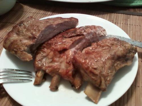 材料:牛胸部小排骨,美式烤肉醬汁(甜的,包含蕃茄、醋、香料、糖等。深咖啡色的。)