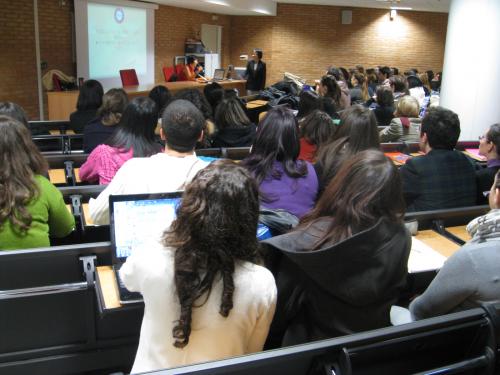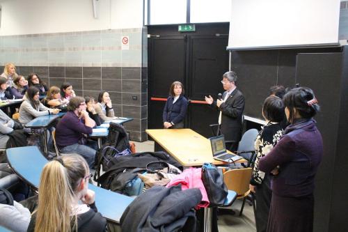 周長楨老師在羅馬第三大學給語言學系一到五年級漢語學生做中級華語會話示範教學後,大家合影。中間:梁所長、Rosa Lombardi教授 | 梁欣榮所長在羅馬第三大學給語言學系一到五年級漢語學生介紹ICLP |