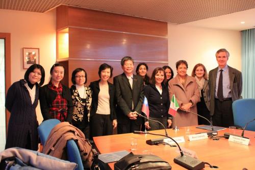 與羅馬第三大學語言學系、語文中心、國際事務處討論合作項目後合影。右起第一:語文中心主任、右二第二國際事務處Adina Maria Pop女士、右四Rosa Lombardi教授 | |