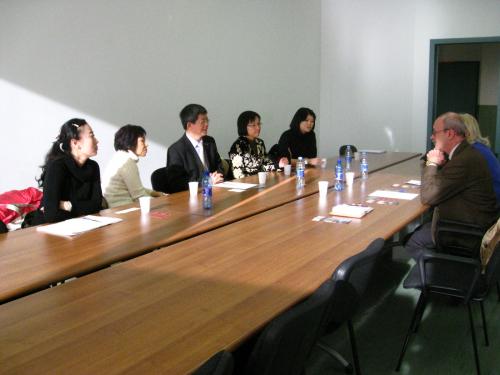 在米蘭大學門口與Antonio Chiesi教授(左三)、Marie-Christine Jullion教授(左二)合影 | 梁欣榮所長等人與米蘭大學東亞系教授討論合作計畫 |