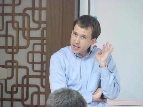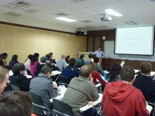 歐教授跟ICLP學生解釋他對中國經濟情況的觀點。在演講中他談到三個主題:第一,中國經濟情況是否在泡沫化破裂的過程中,第二,中國經濟泡沫化破裂的結果會是硬著陸或軟著陸,第三,中國的長期創造潛力。